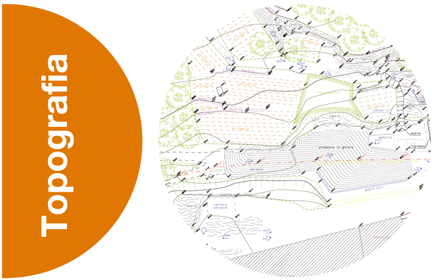 Rilievi del territorio relativi ad ogni tipo di applicazione e pratica, realizzati con strumentazione elettronica tradizionale, laser e satellitare collegati ad un sistema CAD per la restituzione grafica: i Poligonali / Reti / Celerimensura / Tracciamenti / Modelli numerici del terreno a curve di livello / Catasto / Sezioni, profili / Batimetrie / Punti GPS / Livellazioni.